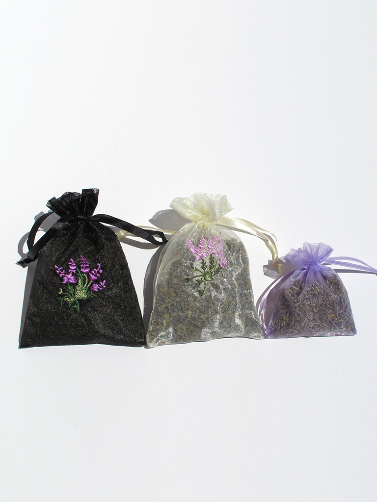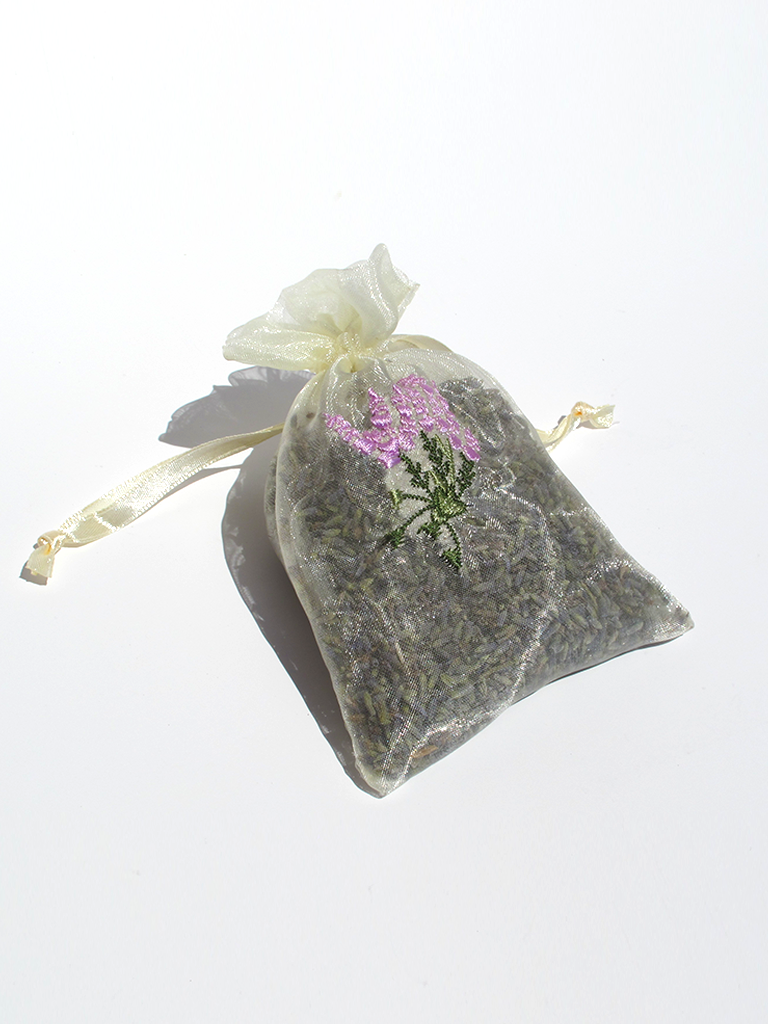 Fragrant lavender buds in a white organza bag with a beautifully embroidered lavender motif for the dresser, closet, or car.