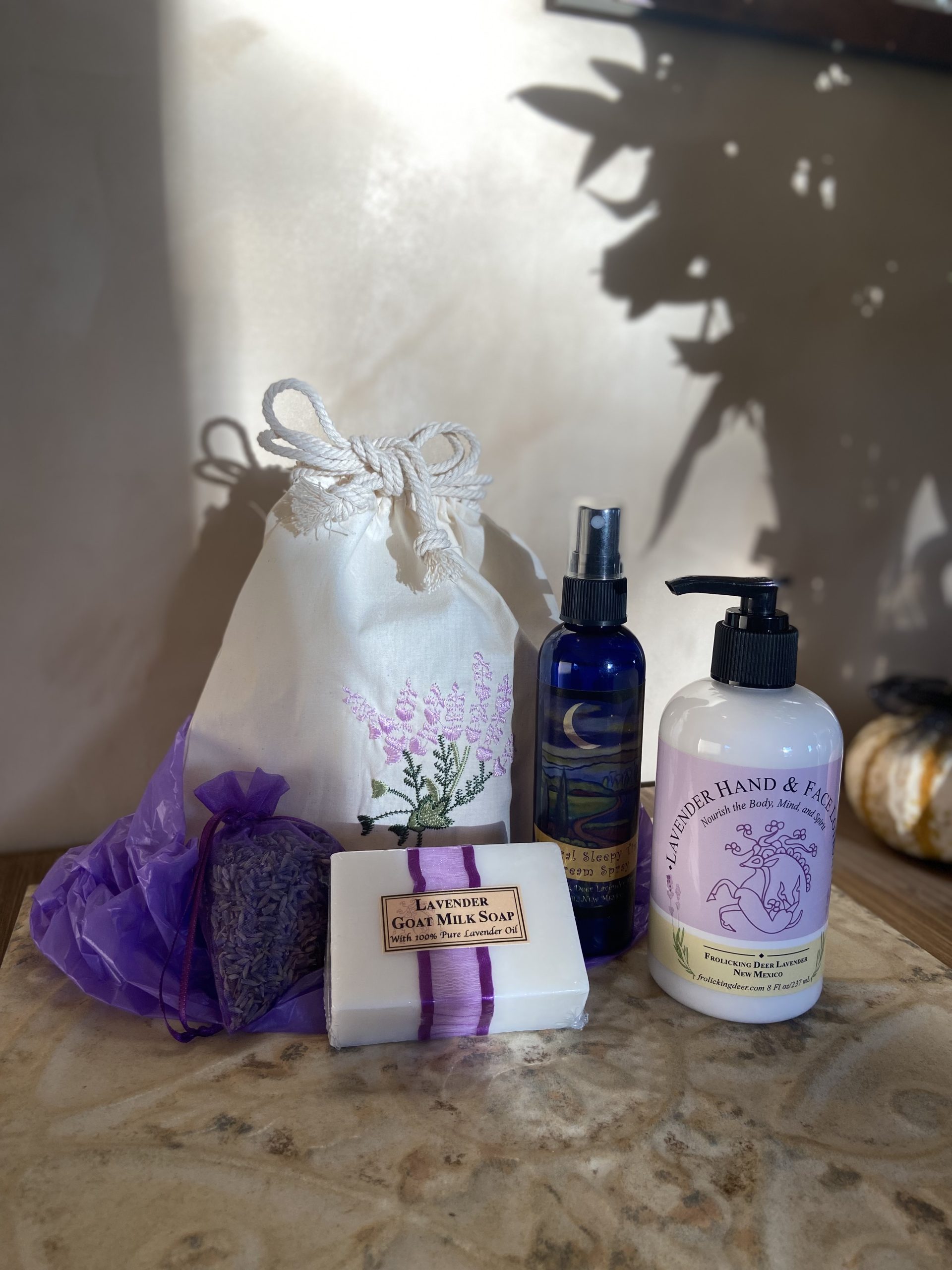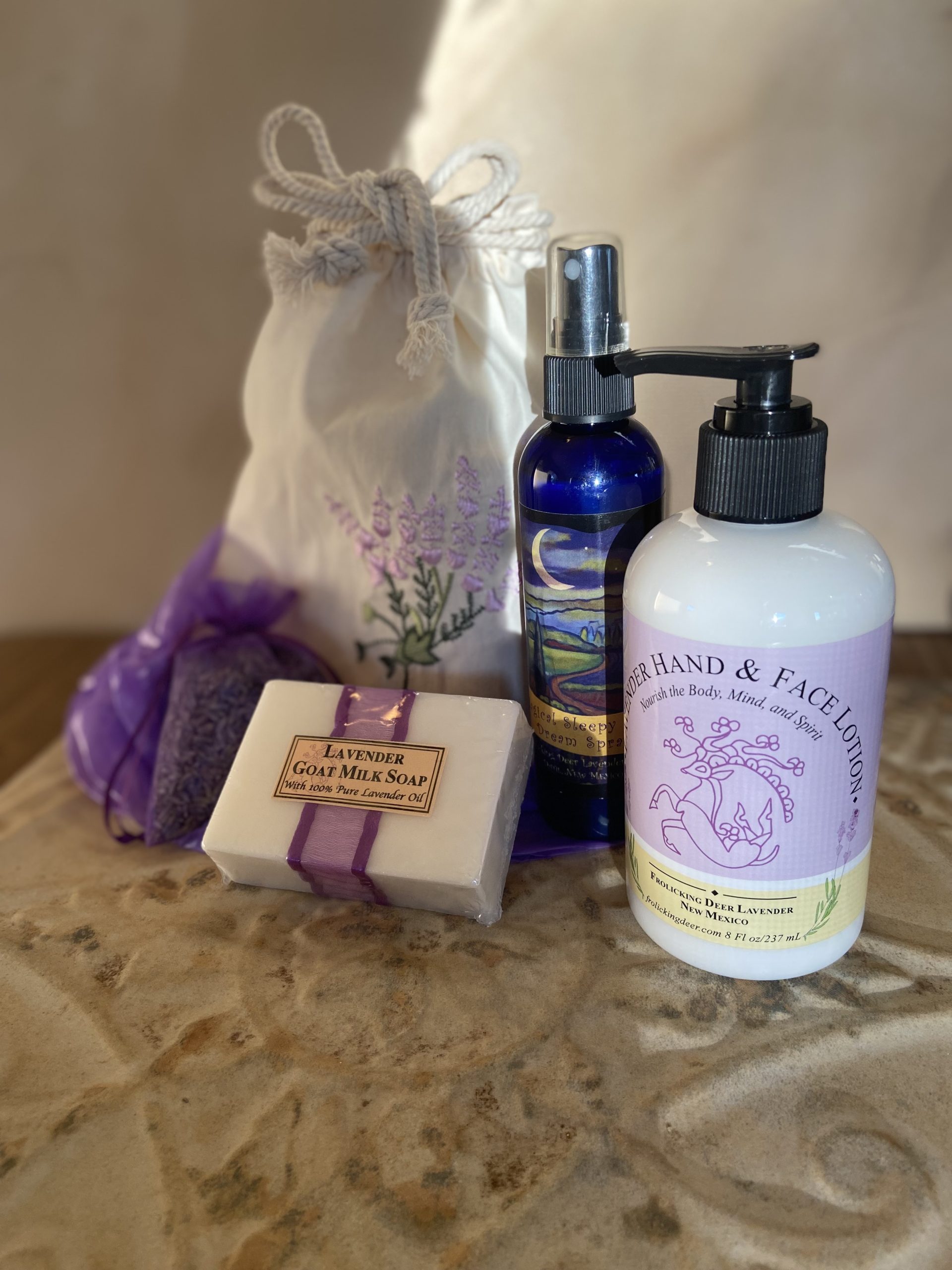 Share lavender with our embroidered lavender muslin bag containing: 8 oz Lavender Hand & Face Lotion, a 4 oz Magical Sleepy Dream Time spray, a bar of Lavender Soap, and a small sachet.