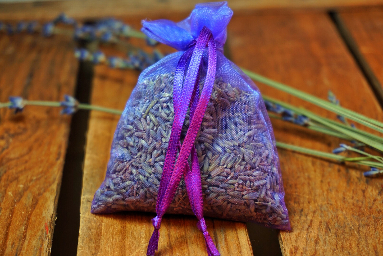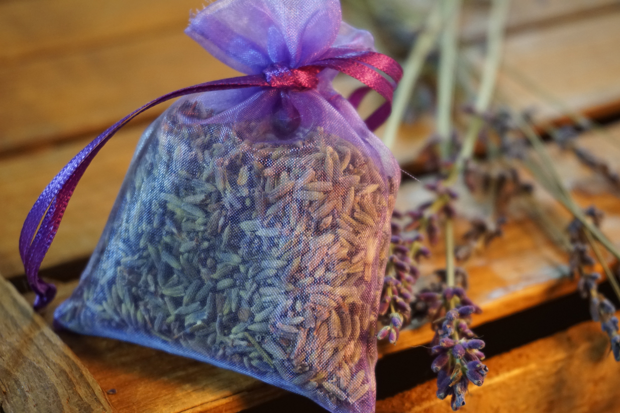 Fragrant lavender buds in a purple organza bag for the dresser, closet, or car.